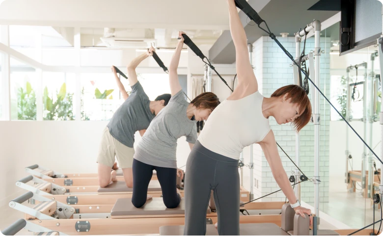 チャレンジしたい方や男性にピラティス専用マシン「リフォーマー」等を使用したグループレッスン。レベル別に用意した多数のレッスンはすべて少人数。丁寧な指導で効果の高い内容です。