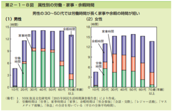 日本では1988年の改正労働基準法の施行を契機に一人当たり労働時間は減少してきましたが、国際的にみると、いまだ総労働時間は相対的に長く、その反面として、いわゆる余暇時間は短い傾向にあります。特に日本の 20~54歳男性で配偶者がおり、仕事を持つ者では、家事・育児に費やす時間の平均は平日で 1時間以内と、欧州主要各国と比べて半分程度となっています。(第 2-1-8図:NHK放送文化研究所「2015年国民生活時間調査報告書」参照)