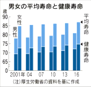 我が国における平均寿命は男性80.98歳、女性87.14歳(厚生労働「平成28年簡易生命表参照」であり、世界においても有数の長寿国として知られています。一方で日常生活に制限のない期間とされる健康寿命は男性72.14歳、女性74.79歳と、特に女性においては、平均寿命と健康寿命の差は12.35年にも及びます。