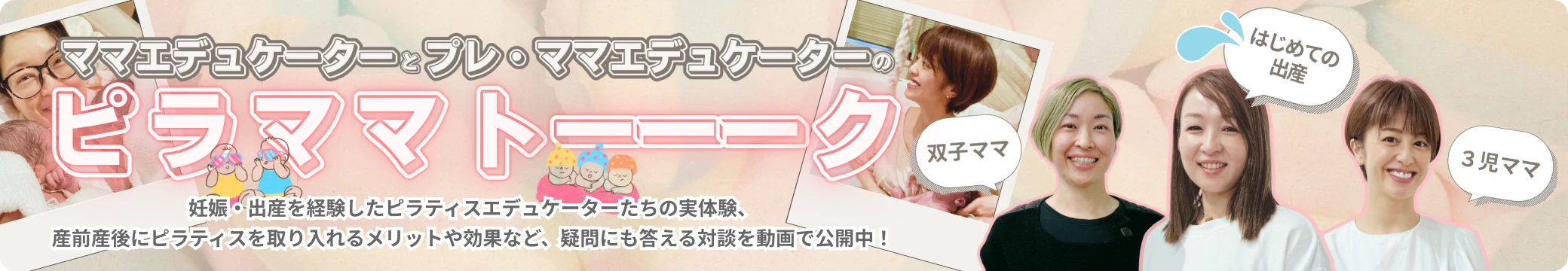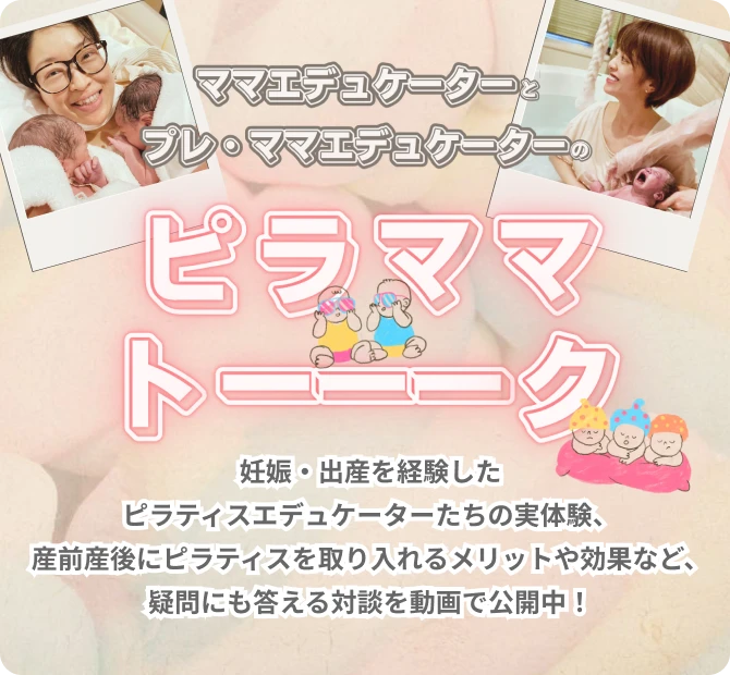 妊娠・出産を経験したピラティスエデュケーターたちが、リアルな体験や疑問に答える全3回の対談シリーズ。プレママエデュケーターのYou.Sが、先輩ママエデュケーターのChiekoとKayoに、出産方法やマタニティピラティス、産後のリカバリーについて率直に質問します。妊娠中の不安や疑問を解消し、安心してマタニティライフを送るための実体験がたくさん語ってもらいました。
