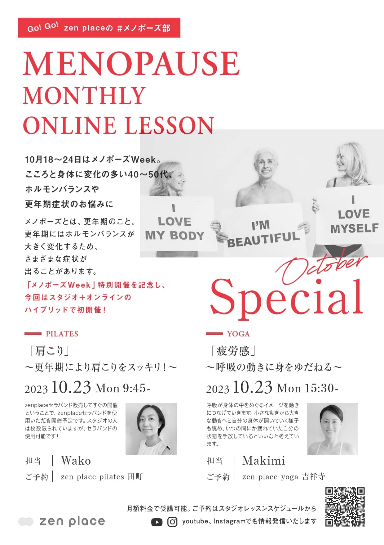 「#メノポーズ部」は、zen placeがこれまで約20年間培ってきた知識や経験、収集している研究結果や論文をもとに、変化の多い 40-50代のホルモンバランスや更年期症状の悩みにフォーカスし、月替わりのテーマを設け、各月テーマに沿った特別オンラインレッスンの開催やYouTube動画の公開、お役立ちコラム記事の公開などを行なっています。