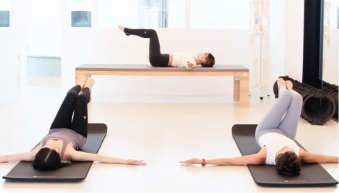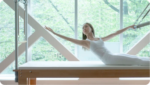 リフォーマーグループは、その中でも代表的なピラティス専用マシン「リフォーマー」を使用したマシングループレッスンです。マシンのサポートを活かしながら、全身をバランスよく動かしていきます。 全身のつながりを意識しながら動けるよう、多くのレパートリーの中から厳選したエクササイズで構成された、レベル別のレッスンを多数開催。