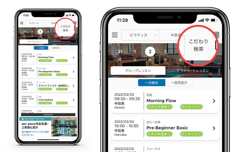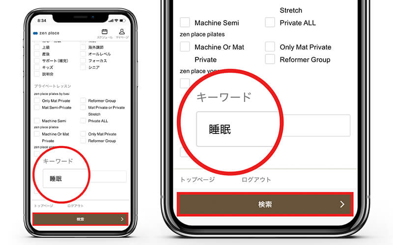スタジオカレンダーから直接ご予約か、アプリのスケジュール・こだわり検索で「睡眠」で検索いただき、ご予約いただけます。