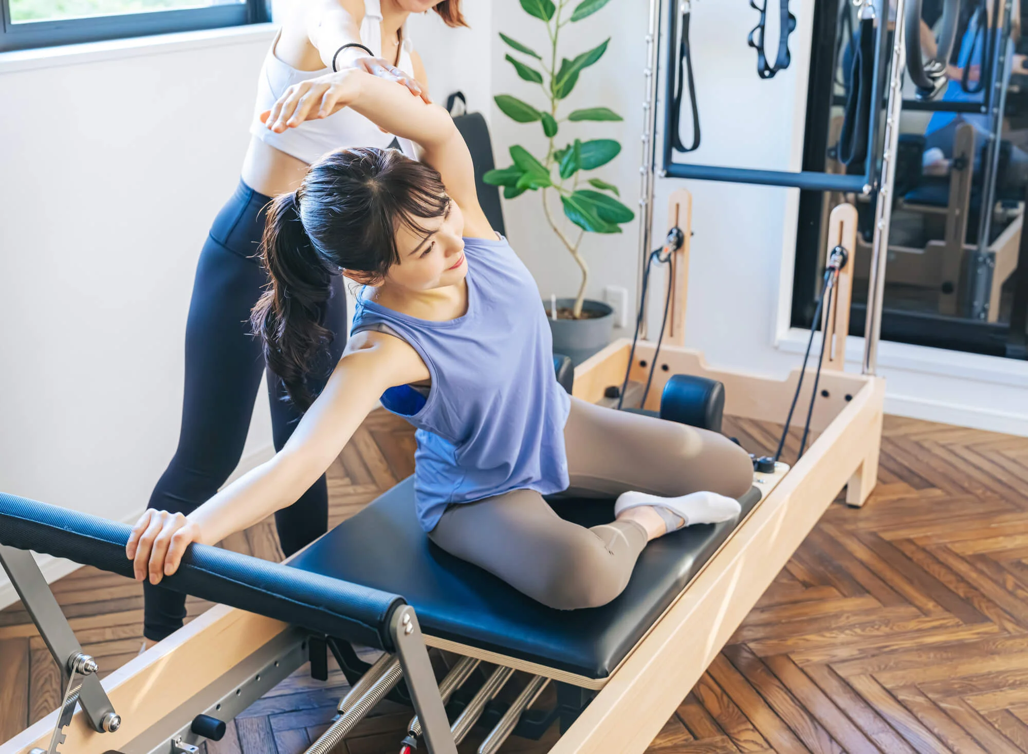 その点、ピラティススタジオであれば、マシンのサポートにより正しいフォームを習得しやすく、またインストラクターの指導によって呼吸法をマスターしやすいという特徴があります。