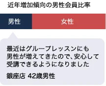 近年、体幹(コア)トレーニングを取り入れることで実績を出したプロスポーツ選手のニュースや起業家や著名人が生活に取り入れることで話題になり男性にも認知度が上がりました。当スタジオの男性比率も一気に増加。