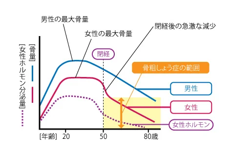 閉経後、女性ホルモンのひとつ、エストロゲンの分泌量が減ると骨吸収を抑える力が弱くなり、削られる量が多くなります。