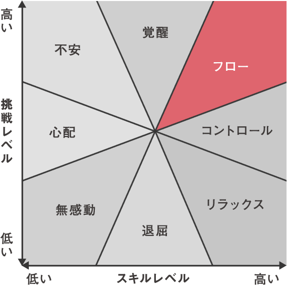 この図は、チクセントミハイが人間の精神状態を8つに分けて定義し、挑戦レベルとスキルレベルの相関関係を整理したもの。フロー状態に入る条件として、スキルレベルと挑戦レベルがともに高いことが必要で、その状況において流れるような無我の境地としての没頭が生じることがわかります。