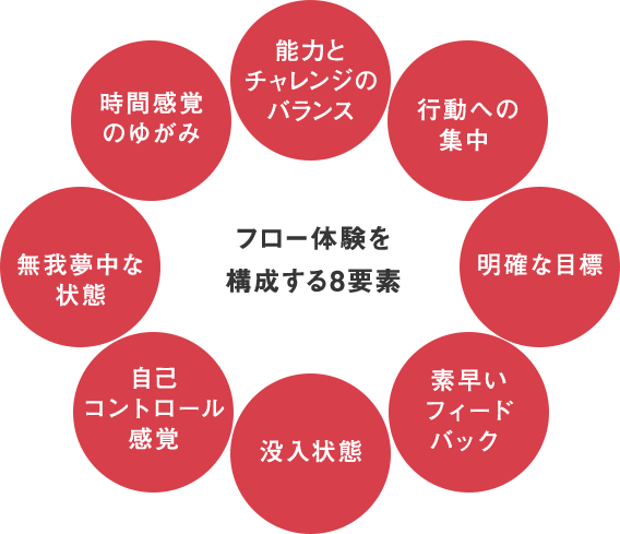 チクセントミハイが提唱する「フロー」(状態・体験)は、時間を忘れてしまうほど、目の前の物事に完全に没頭し、集中できる心理状態を指します。