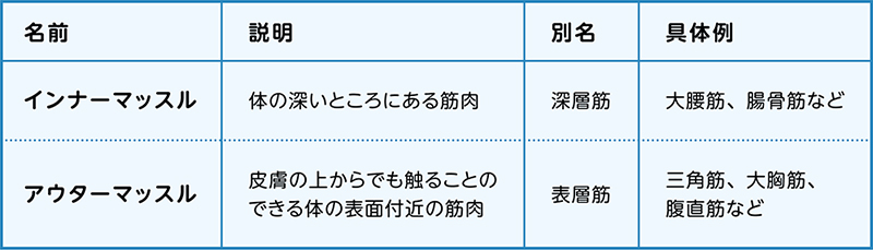 全身の筋肉は、インナーマッスルとアウターマッスルに分別することができます。