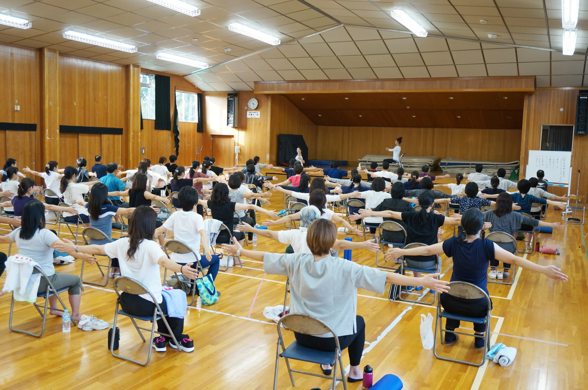 息を吐きながら、背骨を下から一骨一骨動かすように、ゆっくりと上体を起こしていく。ゆっくり……上体を…起こ……「あれ? 全然起き上がれない!」。芋虫のような姿勢のままもがく隣同士が、顔を見合わせ、自然発生的に起こる自虐的な笑い声……。