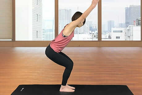 ヨガの基本ポーズ。椅子に腰かけたようなスクワットの姿勢で下半身の筋肉を鍛えます。