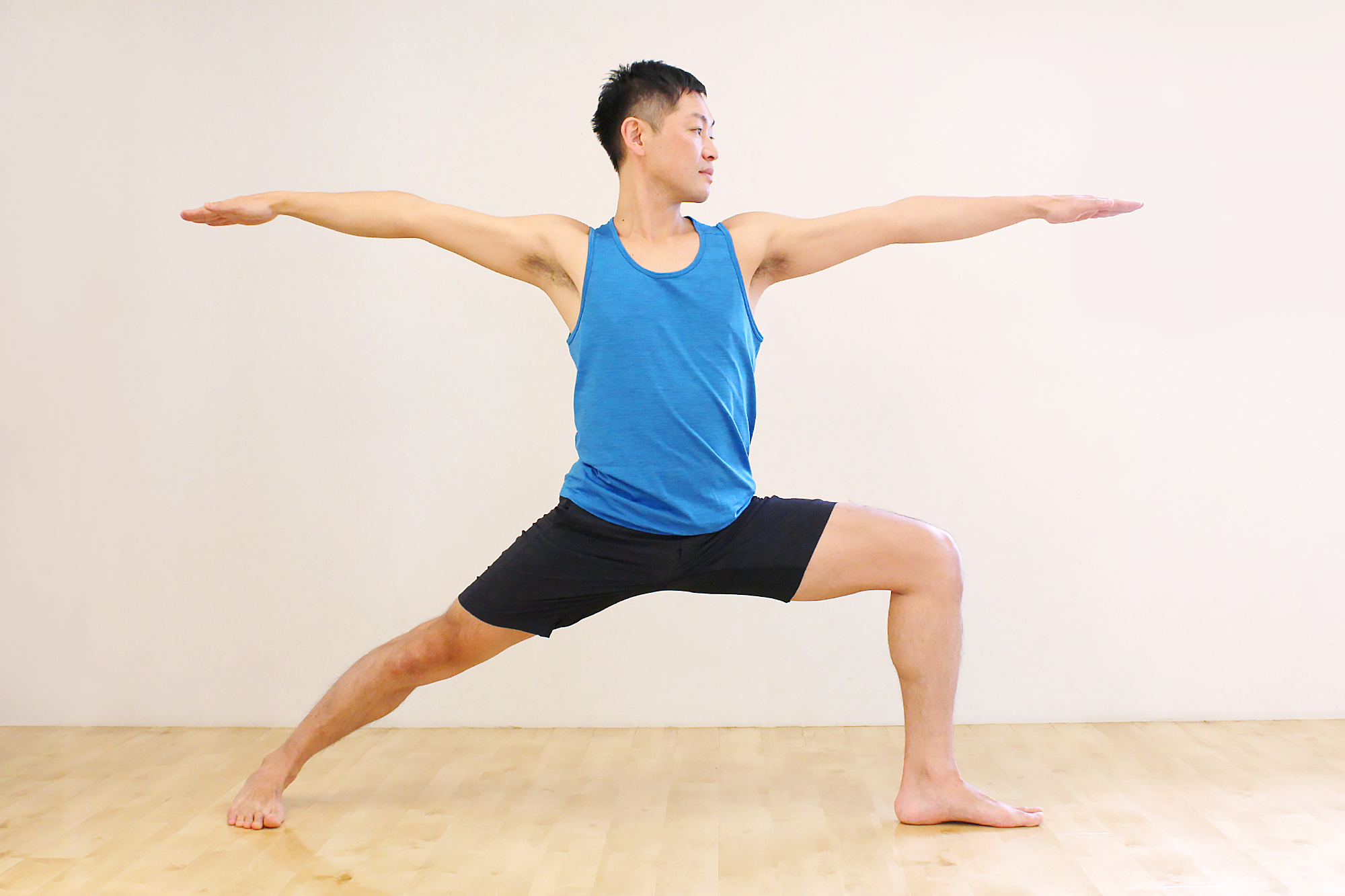 - 両腕を肩の高さで真横に広げ、手首の真下くらいの位置に足がくるよう立つ