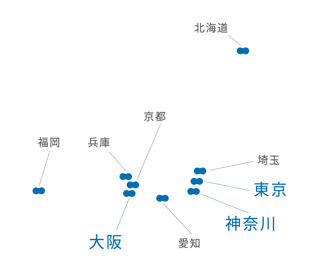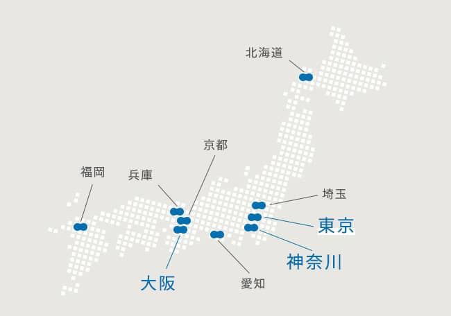 横浜神奈川県横浜市西区北幸2-1-22 永岡ビル2F横浜みなみ西口神奈川県横浜市西区南幸2-19-4 南幸折目ビル8F横浜元町神奈川県横浜市中区山下町123-1 横浜クリード8階日吉神奈川県横浜市港北区日吉2丁目2-14 第2星野ビル201青葉台神奈川県横浜市青葉区青葉台 2-6-1ケンシュウ第6ビル3F綱島神奈川県横浜市港北区綱島西2-6-17 黒川ビル3F戸塚神奈川県横浜市戸塚区戸塚町8 ラピス戸塚2 2階鎌倉神奈川県 鎌倉市御成町7-8 御成エバービル2階藤沢神奈川県 藤沢市南藤沢 2-8 2002K&Sビルディング4階東戸塚神奈川県 横浜市戸塚区品濃町 549-2 三宅ビル702茅ヶ崎神奈川県 茅ケ崎市新栄町 7-5 CHIGASAKI Biz―Naz4階3室