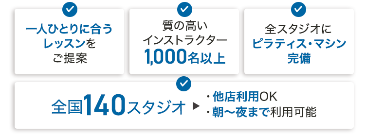 時間と場所の融通性と利便性が高い、お客様に最適なレッスンの受け方をご提供します。近隣に複数店舗あるため、あなたの生活スタイルに合わせて、他店舗を自由にご利用頂くことができます。また、レッスンはアプリを活用して簡単に選ぶことができます。あなたのスキマ時間を有効活用ください。