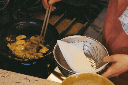 7.ほんのり黄金色に揚がったら、よく油を切りながら引き上げる