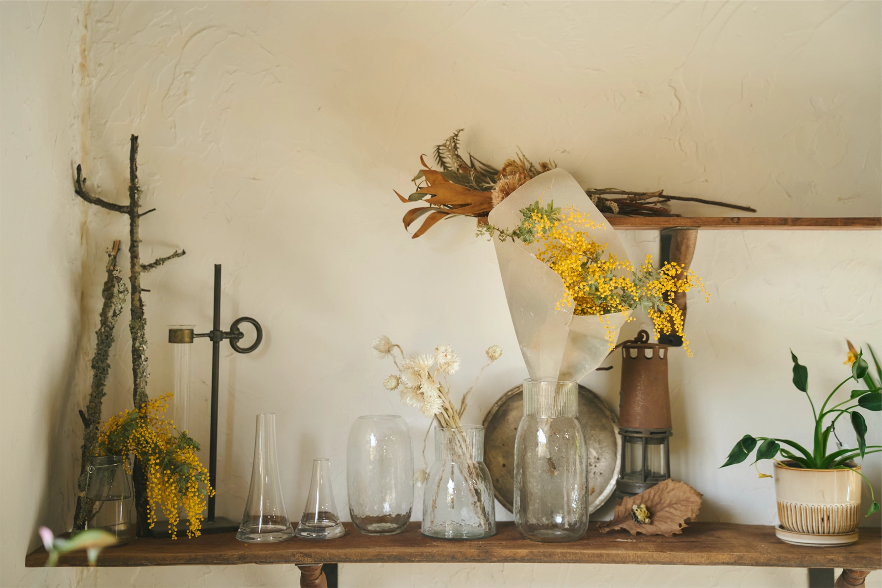 お店には季節の植物や花々が並び、取材時にはミモザのリースが飾られていました。月見台住宅を選んだ理由は、自然と暮らしが地続きになっていることが実感できる場所だったからだと話します。