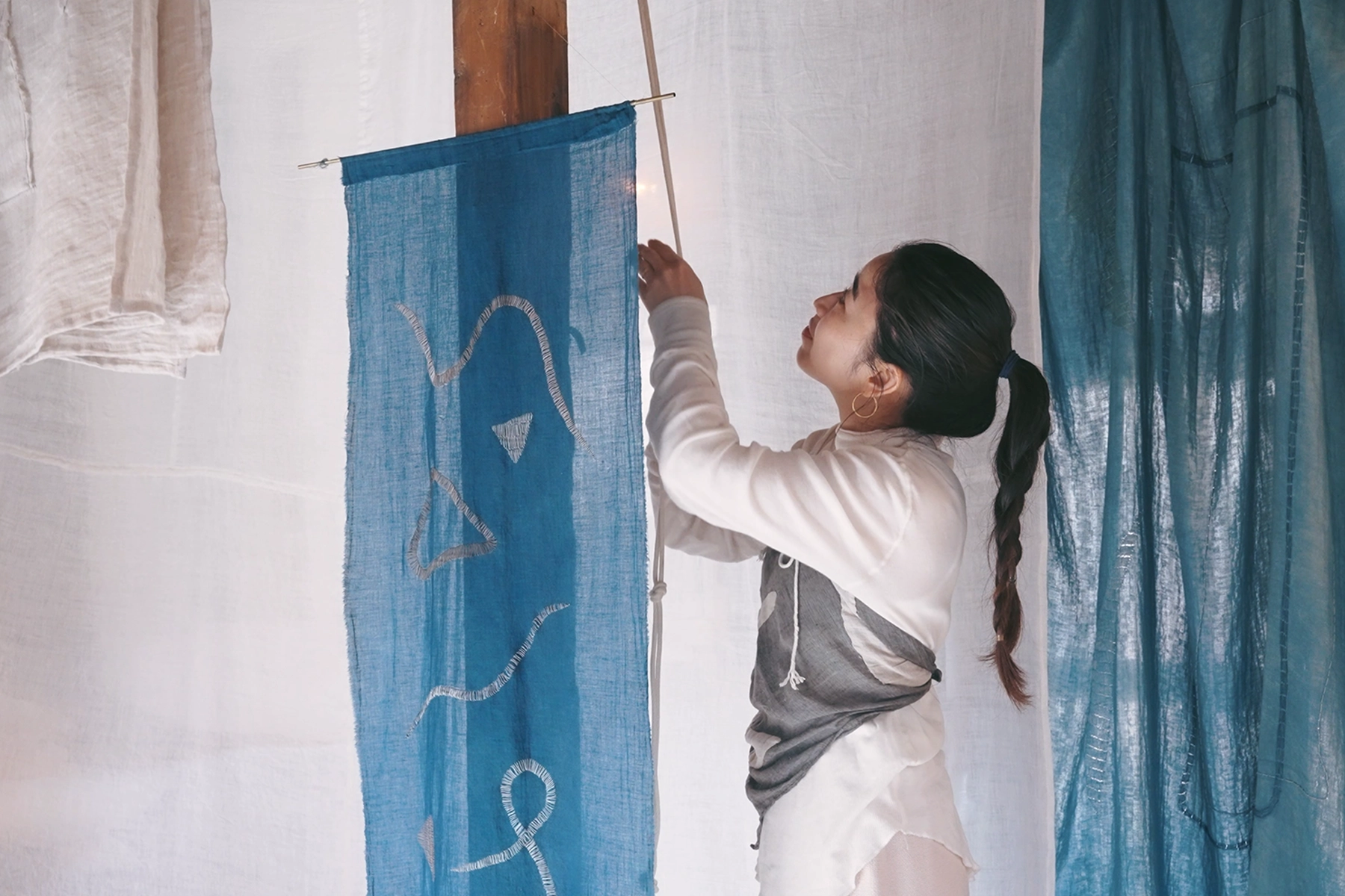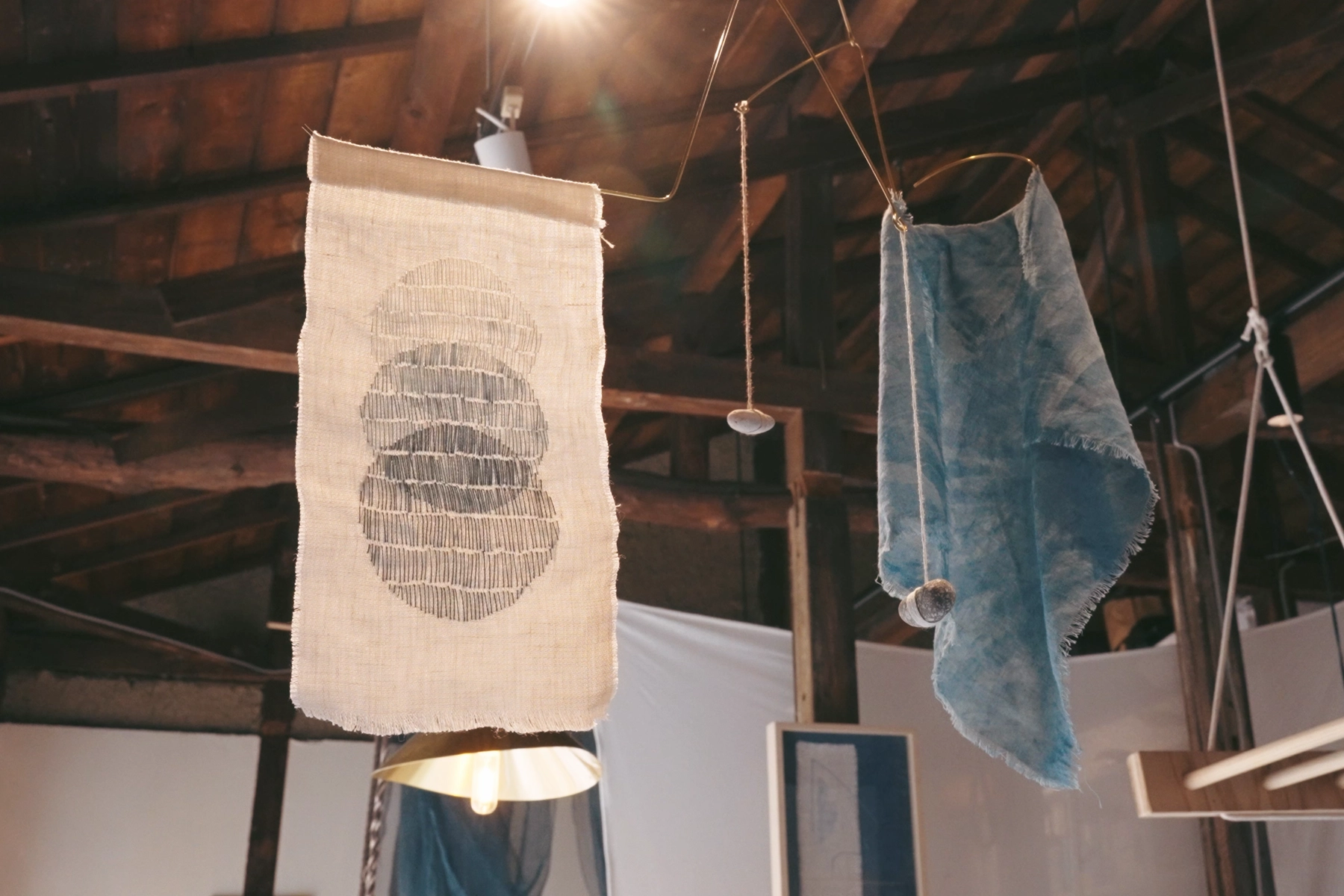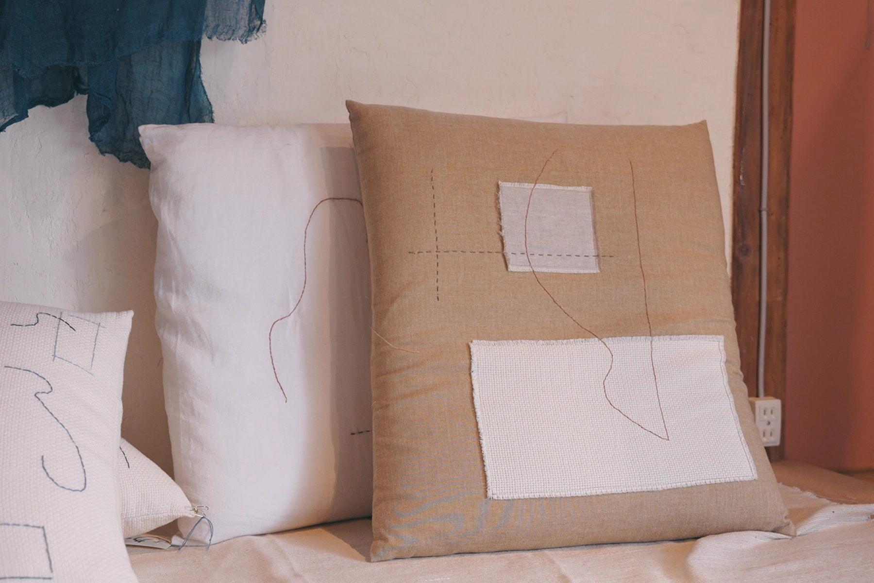 作品に使う布や糸は、天然素材を選んでいるそう。さらに、布そのものも「新しく作る」のではなく「すでにあるもの」を大切にしたいという想いが強くあります。