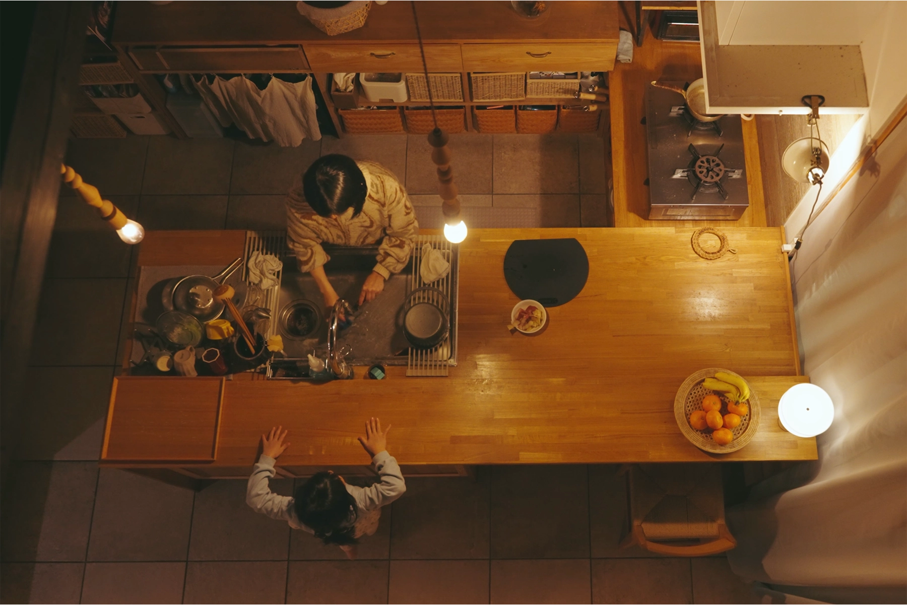 「キッチンは元々、北側の暗い場所にありました。ただ、家の中心にキッチンがある生活を送りたくて、綺麗な日差しが差し込む東側へ移すことに。今では家族4人が自然と集まる場所となっています」