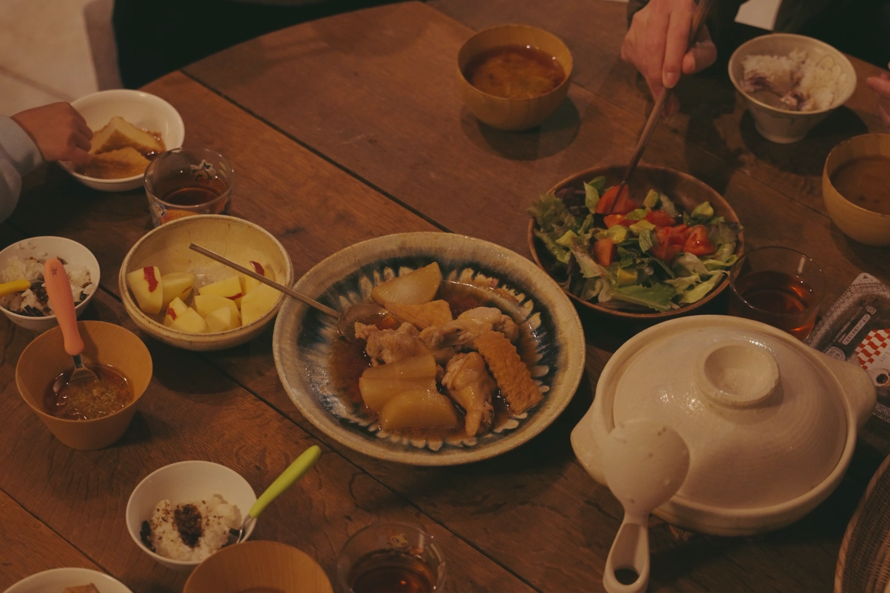家族それぞれが思い思いに過ごしながら、気づけば同じ場所に集まっている。このテーブルは、そんな時間が重なる場所になっています。この日の夜ごはんは、土鍋で炊いたご飯にキャベツの味噌汁、庭で採れたサラダ菜のサラダ、鳥手羽の煮込み。
