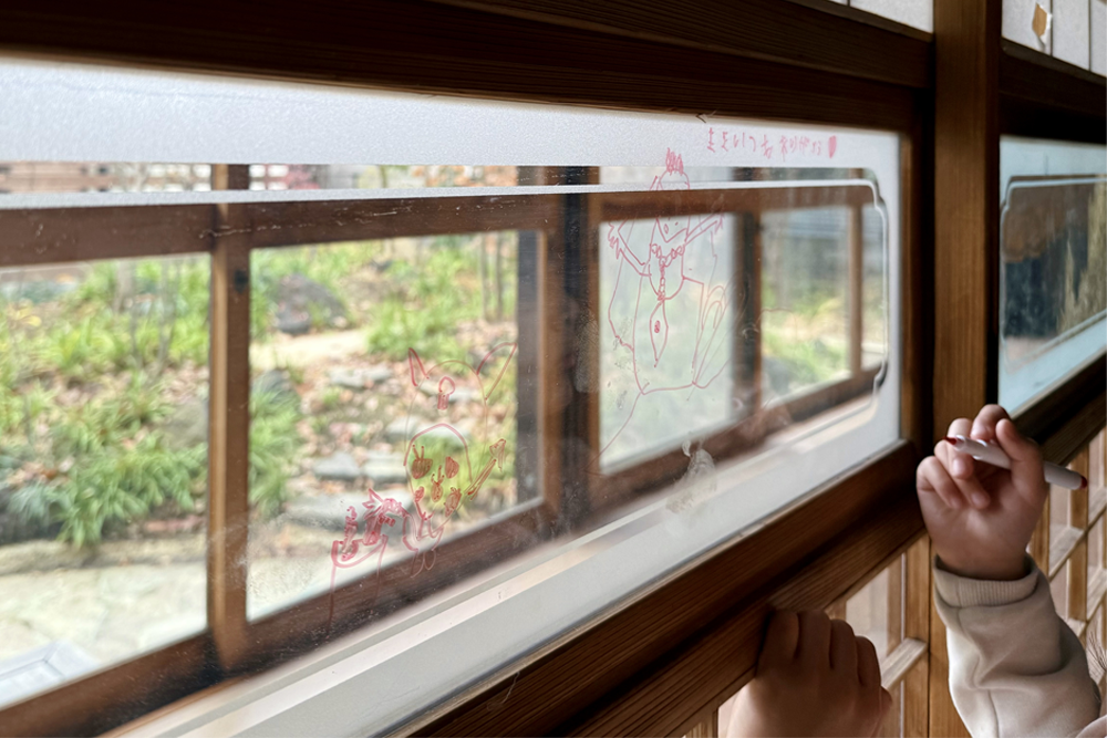 今、わが家の建具は子どもたちのお絵かき帳です。息をはーっと吹きかけて白くなったところに絵を描いたり、チューをするとキスマークが残るのが面白いみたい。硝子にペンで描いた絵を「見て見て!」と誇らしげに見せてくれます。