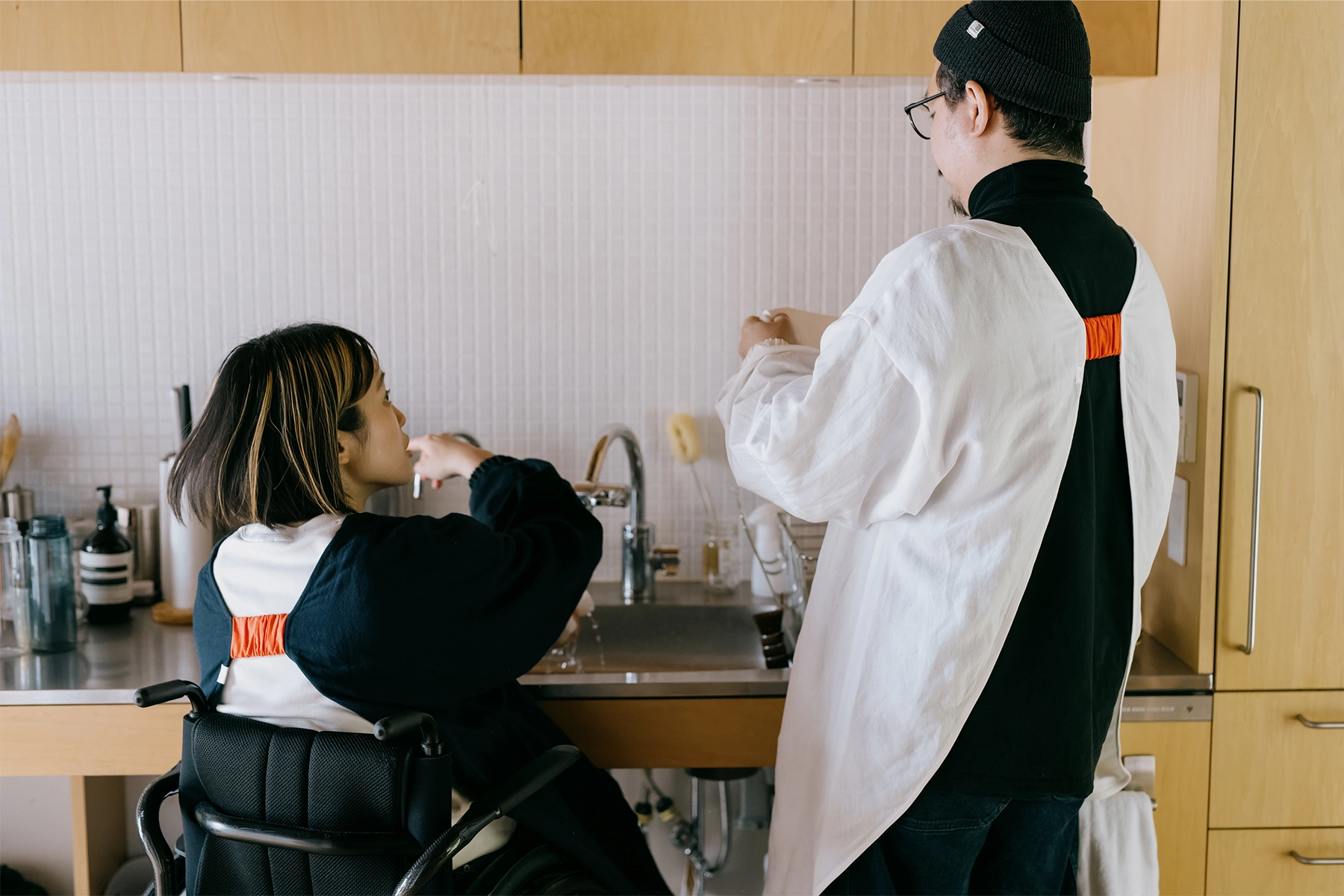 そう話してくれたのは、代表の堤大洋(ともひろ)さん。大洋さんは車椅子ユーザーのパートナー・志歩さんとの生活の中で、誰もが楽しく使える割烹着をつくろうと決意しました。