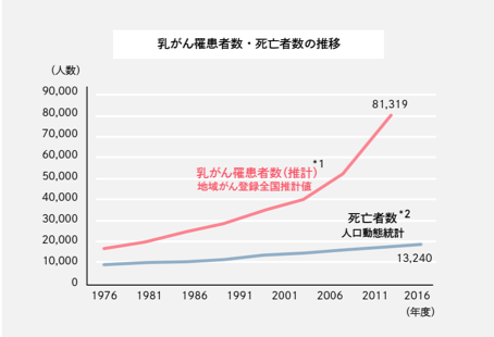 乳房に、はりめぐらされている乳腺に悪性の腫瘍ができるのが乳がんです。日本における乳がん患者は12人に1人といわれおり、乳がんは罹患者数、死亡者数共に年々増加しております。2018年には9万人の日本人女性が乳がんにかかると予測(※1)されました。